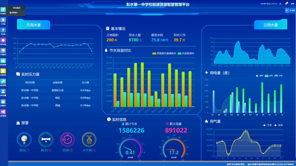 建设学校能源资源智慧管理平台。安装节水智能监管智慧平台,通过电脑和手机实时在线监测校园各区域用水量数据变化,并进行大数据分析。超过预警值时,系统通过微信等方式直接向用户报警提醒,实现节水可视化、数据化管理。