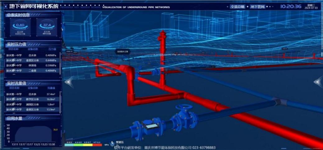 建设地下管网数字孪生可视系统。开发建设地下管网数字孪生可视系统,通过计算机建模,三维立体呈现学校地下管网的安装位置、管径、流量、实时压力等信息,直观体现管路改道等变化,为测漏、堵漏、维修工作提供数据支撑;有效减少因管线资料不够完整而造成的施工隐患,推进管线精细化管理。