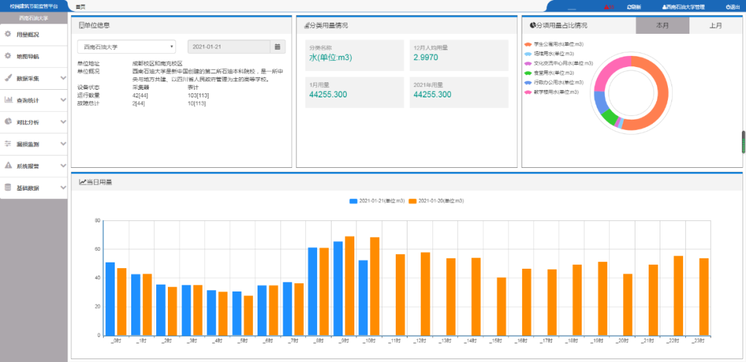 西南石油大学是新中国创建的第二所石油本科院校,是一所中央与地方共建、以四川省人民政府管理为主的高等学校。学校有成都、南充两个校区,校园总面积200万平方米,其中成都校区于2020年实施了合同节水管理项目。学校现有在校学生40801人(含非全日制统招硕士研究生、非全日制统招博士研究生和留学生)、教职工2753人